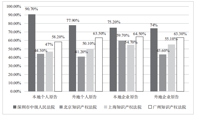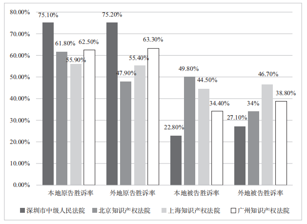 图1 北京、上海、广州、深圳四地知识产权案件当事人胜诉情况统计图