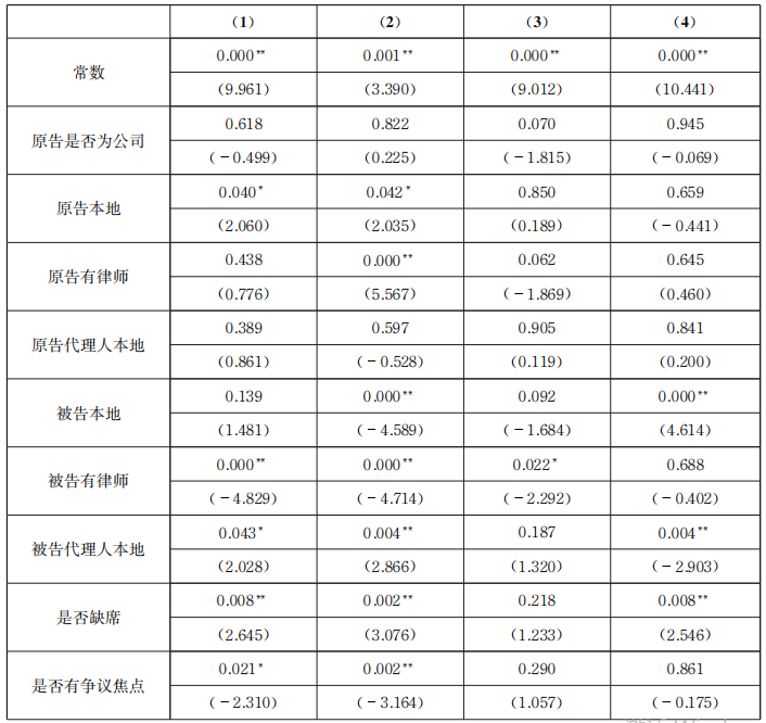 如表2所示,在普通法院(1),将当事人类型分类为“企业”和“个人”后,当事人来自本地会对其胜诉率产生显著的正向影响关系,对方当事人有律师会对其胜诉率产生显著的负向影响关系。这也说明了律师在诉讼活动乃至司法地方化语境中的作用。