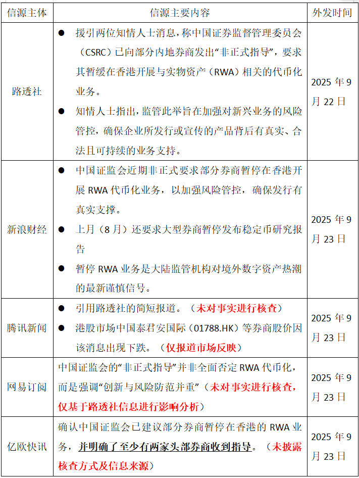 9月,外网某知名媒体放出一个大消息:我国证监会要求部分在港展业的中资券商暂停开展RWA业务。后续,该消息获得了我国多家知名媒体“背书”:我国内地证监会通过窗口指导的方式,向至少两家中资券商传达了暂停 RWA业务的意思,但未出具任何书面指令。